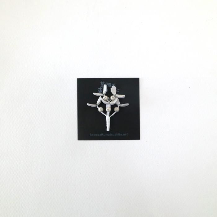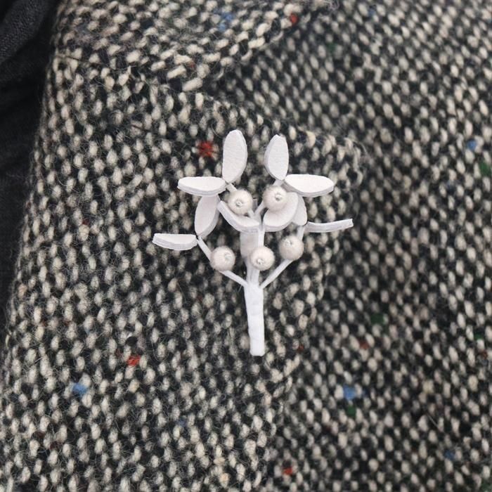 主にピッグスキンを材料にして東北の工房でブローチやオブジェを製作されています革細工まつしたさんの冬でも緑を保つ強い生命力から「永遠」を象徴する縁起物とされ、幸運や魔除けの象徴というヤドリギ/のブローチの白ヴァージョンです。